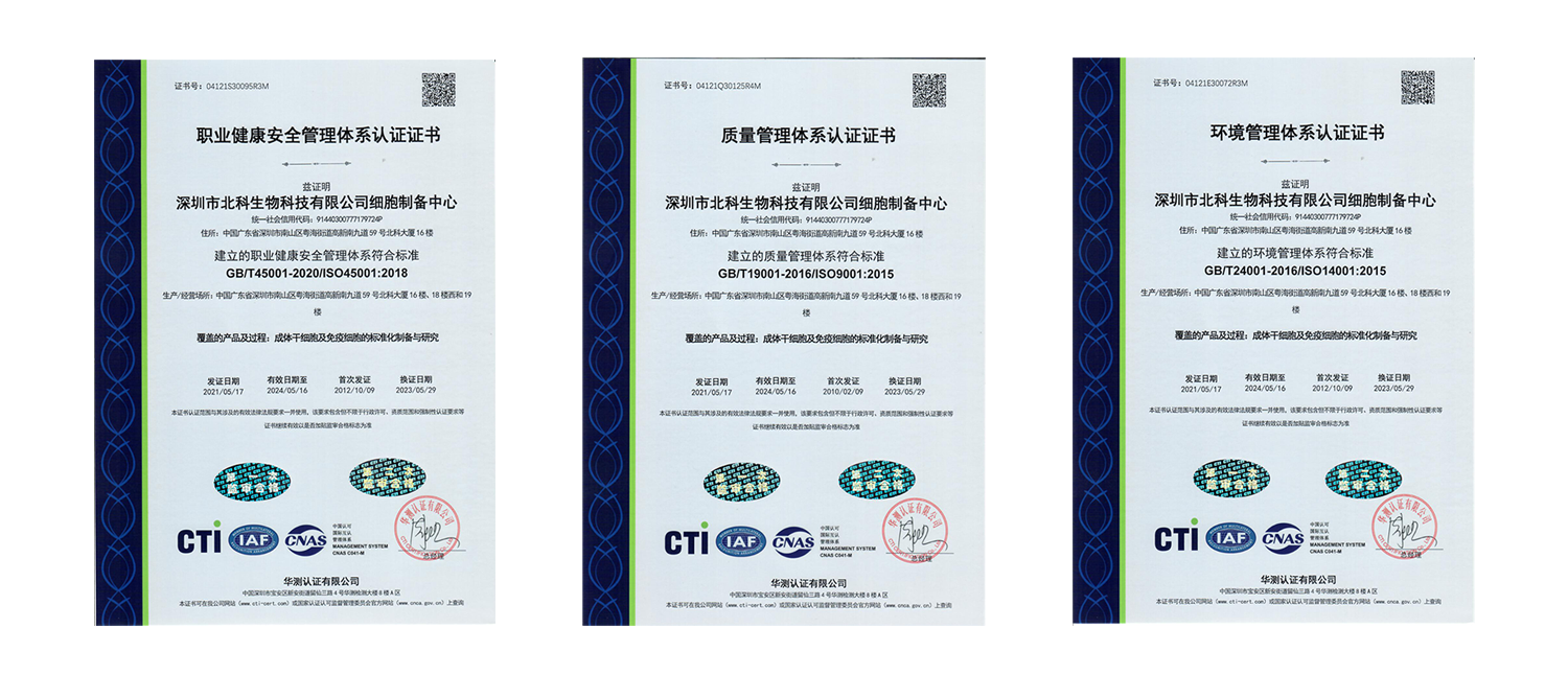 北科生物是國內(nèi)較早在細胞生物醫(yī)藥領(lǐng)域引入質(zhì)量管理概念的企業(yè),于2010年首次進行了ISO9001質(zhì)量管理體系認證,并于2012年整合體系完成“質(zhì)量、環(huán)境、職業(yè)健康安全”三標一體認證。同時北科生物江蘇分公司是中國大陸首家引入并通過“血液和生物治療發(fā)展協(xié)會”((Association for the Advancement of Blood & Biotherapies,簡稱AABB,原美國血庫協(xié)會)認證的綜合性細胞庫。2017年5月,北科生物深圳細胞庫(深圳綜合細胞庫)的四項自體細胞(人臍帶來源間充質(zhì)干細胞、人臍血來源造血干細胞、人胎盤來源間充質(zhì)干細胞、人外周血免疫細胞)儲存應(yīng)用技術(shù)質(zhì)量管理體系同時通過AABB認證,標志著北科生物已經(jīng)建立起細胞制備、儲存及臨床轉(zhuǎn)化應(yīng)用服務(wù)的整合型技術(shù)管理模式。