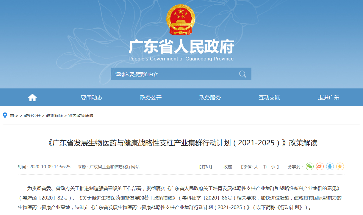 近日,廣東省科學(xué)技術(shù)廳、發(fā)展和改革委員會、工業(yè)和信息化廳、衛(wèi)生健康委員會、市場監(jiān)督管理局等五部門聯(lián)合發(fā)布《廣東省發(fā)展生物醫(yī)藥與健康戰(zhàn)略性支柱產(chǎn)業(yè)集群行動計劃(2021-2025年)》。